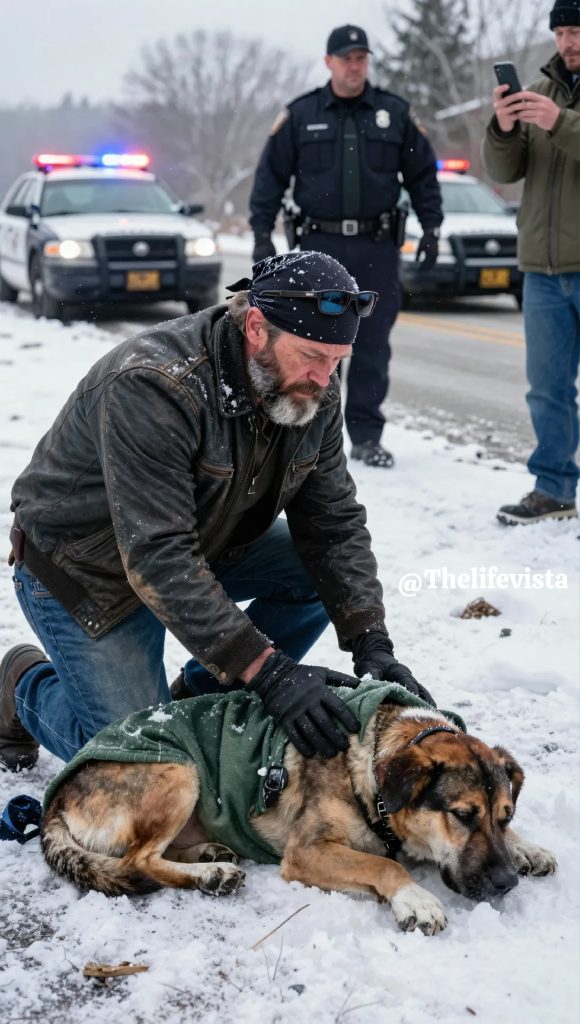 The man placed his palm against the dog’s chest, his face drawn tight with focus as he counted the shallow rises beneath his hand, his voice low and steady as he murmured for the animal to keep breathing. The shouting swelled around him, accusations flying, people insisting he was hurting it, stealing it, doing something terrible right in front of them, but he leaned closer instead, using his own body as a shield as snow gathered on his shoulders and melted against the leather.