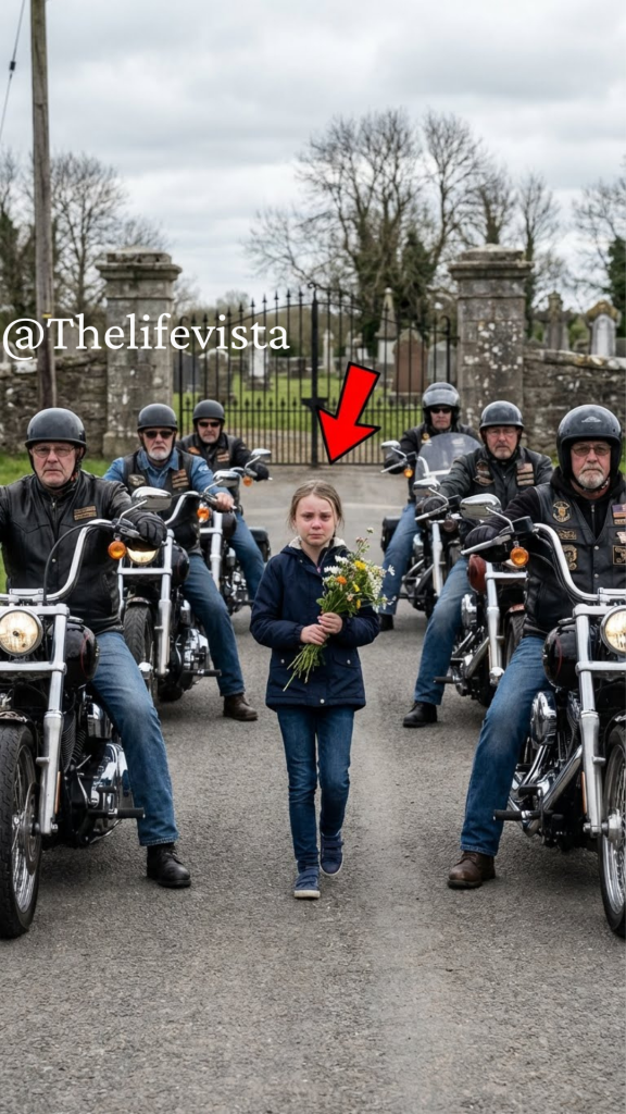 Her hands trembled as she clutched the bouquet, laughter from passing boys echoing cruy. She walked alone toward the cemetery gates until the thunder of engines grew behind her and leatherclad guardians formed a convoy of respect. The town of Hollow Pine sat quietly at the edge of a mountain valley where pine trees stood like sentinels against the sky. Life moved slowly there, farmers, shopkeepers, and kids chasing each other down cracked sidewalks.