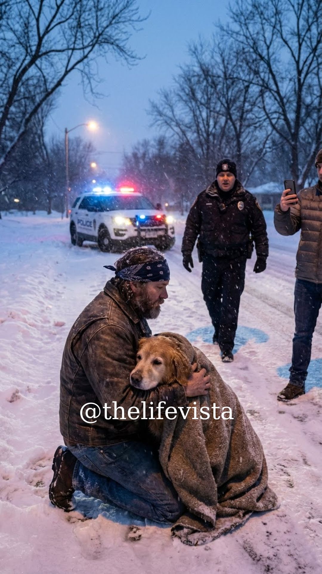 Phones appeared from pockets and doorways, red recording lights blinking like tiny warnings in the dark. From a distance, it looked bad — a rough-looking biker kneeling over a helpless animal in the middle of a snowstorm. The assumptions wrote themselves.