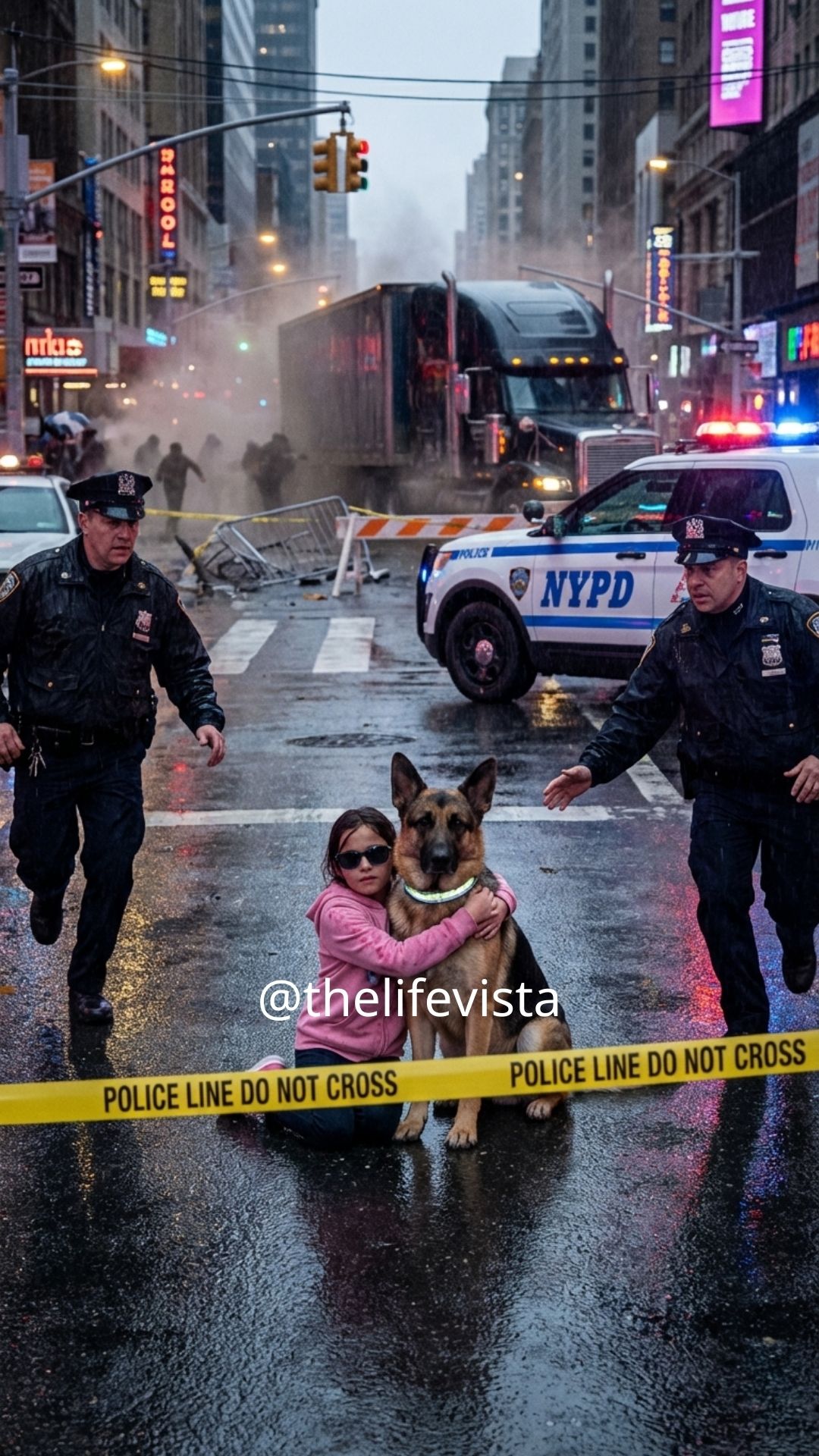To their eyes, they saw a large dog planted in the middle of a busy pedestrian crossing, body tense, blocking movement, and their training filled in conclusions before context could catch up. Someone had called in a report about an “aggressive stray causing a hazard,” and adrenaline completed the story before facts had a chance to speak. They didn’t yet see the vest clearly. They didn’t see Maya’s trembling hand gripping the harness, nor did they hear the steady breathing of a dog trained never to panic first.