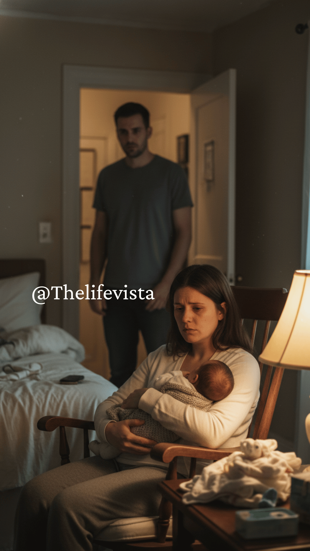 In the dim living room, a single lamp glowed over a pile of unopened baby bottles, formula containers, and a half-folded blanket. The silence was heavy, broken only by the faint whimper of their newborn, Aiden, from the nursery. Jenna sat in the rocking chair, her pale face illuminated by the soft blue nightlight. Dark circles ringed her eyes; the incision from the emergency C-section still throbbed under her robe.