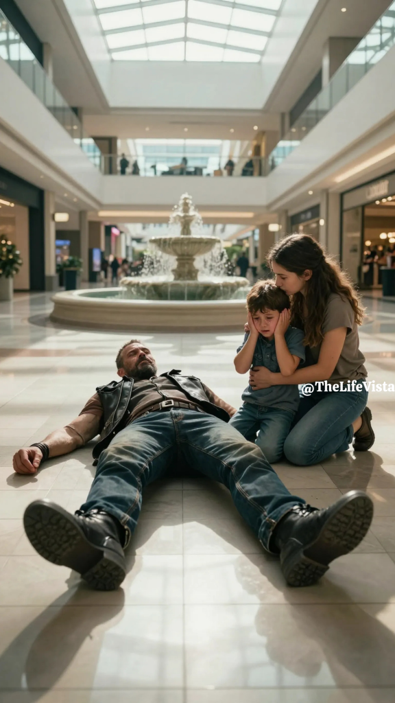 Rowan’s cries pierced the air again as the bass continued pounding through the speakers. The bikers did not move or speak further. Their stillness formed a protective barrier that slowed the rush of people around the fountain and created a pocket of space where the child could begin to breathe more steadily. To those watching from the outer edges of the atrium, the scene still looked unusual and potentially disruptive. Yet within the quiet circle, a fragile sense of safety began to emerge.