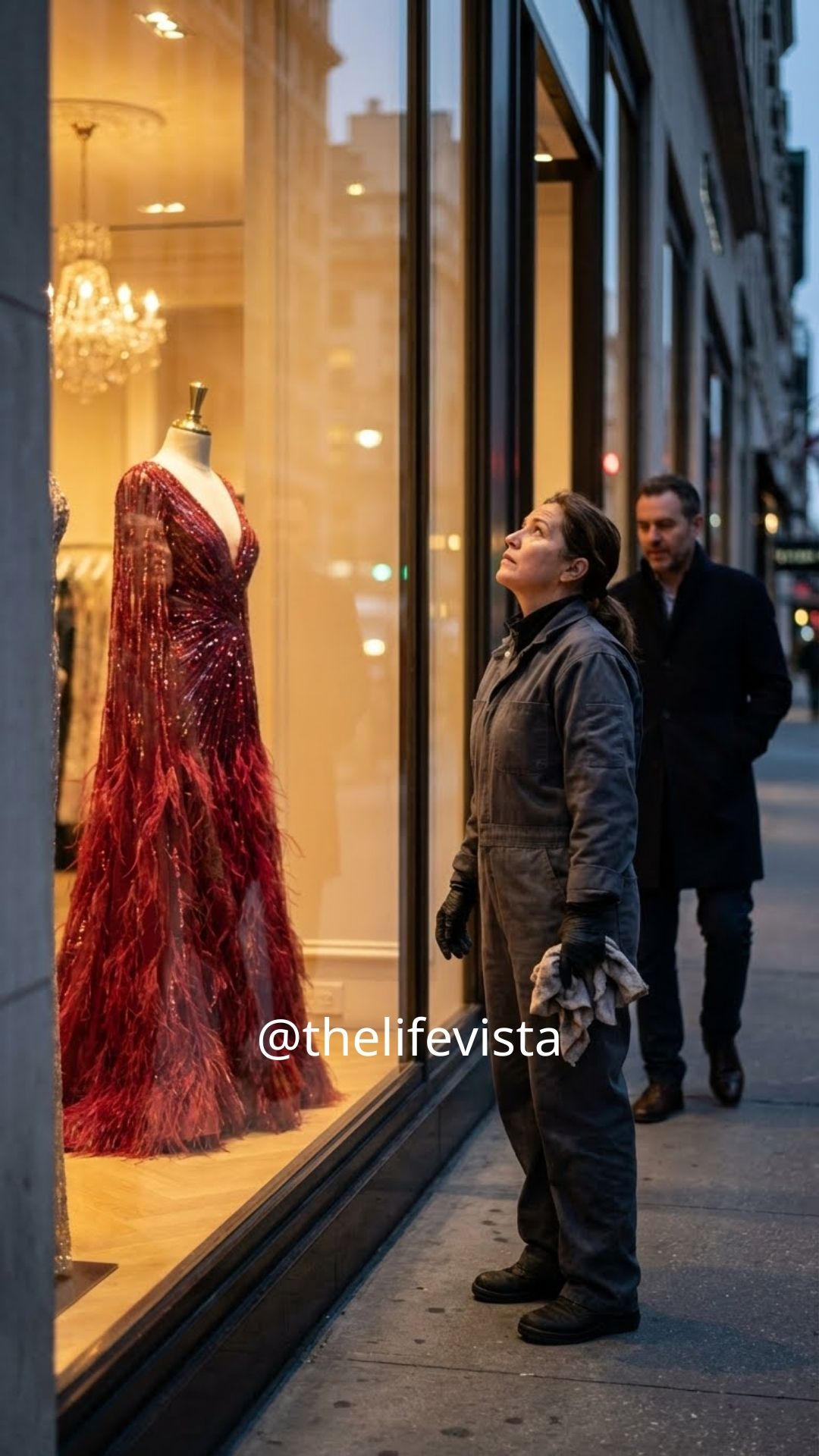 Behind Evelyn, the red dress adorned with rubies—the same one he had mocked—now gleamed beneath the lights, his name engraved discreetly on the plaque below it.