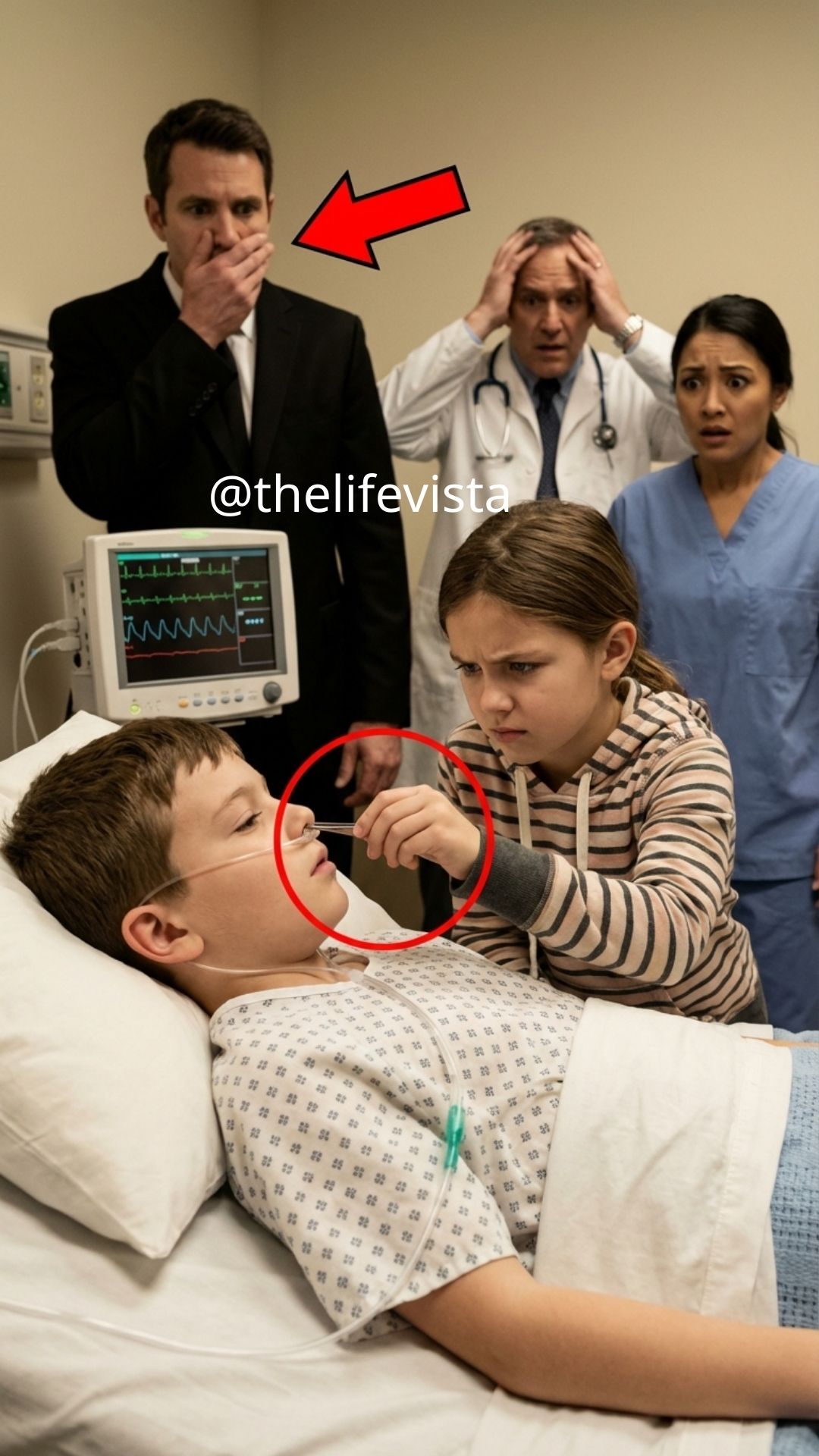 Gradually her attention drifted toward the glass wall of the intensive care unit, where the hospital staff had gathered in tense clusters and machines blinked constantly with restless lights. Through the thick glass she could see Ethan Caldwell lying unconscious on the hospital bed while the soft hum of medical equipment surrounded him like a fragile barrier between life and silence. The scene looked calm on the surface, yet something about it felt deeply wrong to the girl who had learned that danger often hides inside ordinary moments.