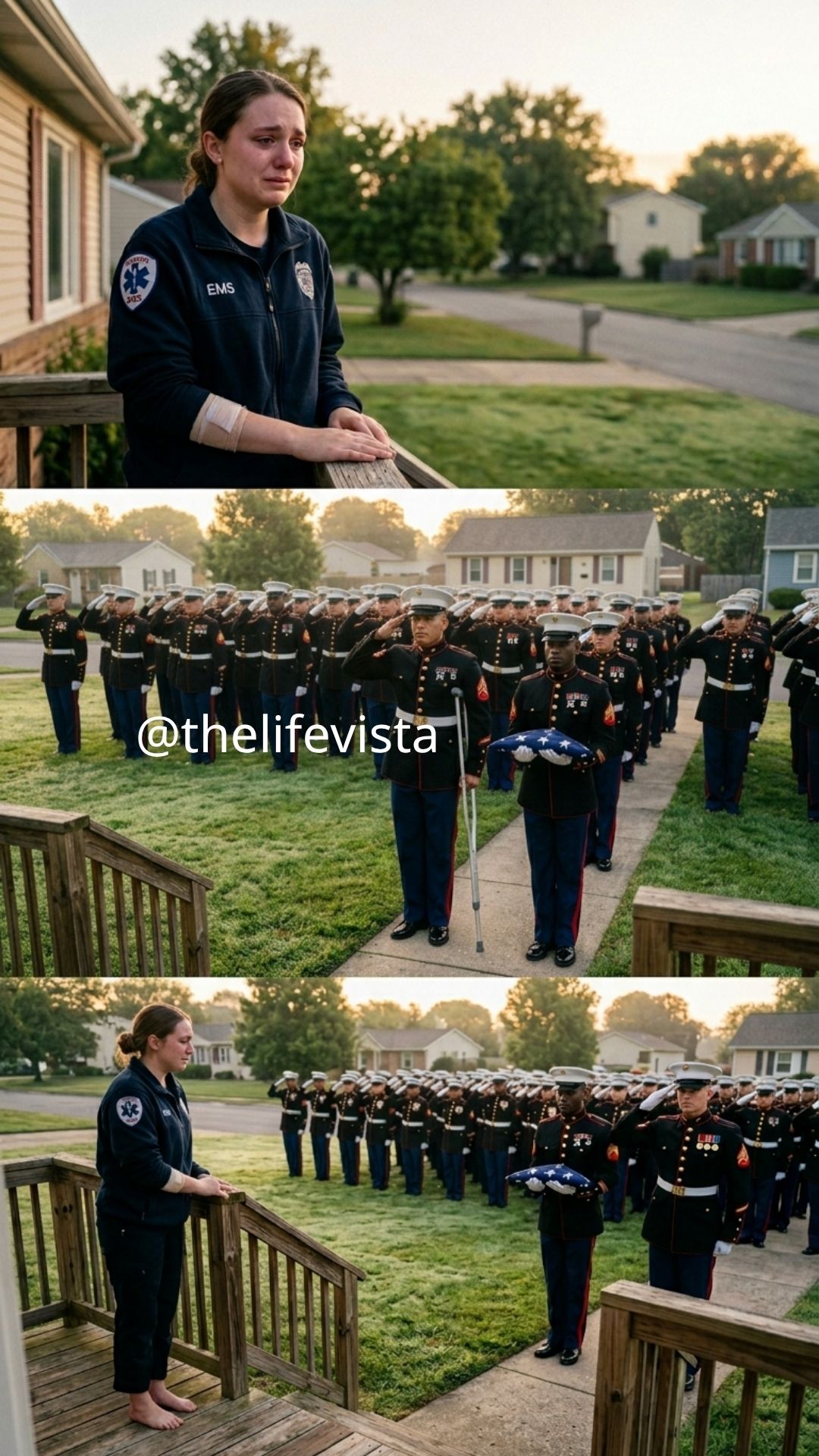 She suffered multiple deep wounds while protecting an injured man. She almost didn’t . But the next morning, she woke to the sound of footsteps outside and opened her door to find over 100 Marines standing in perfect formation on her lawn, all in full dress uniform.