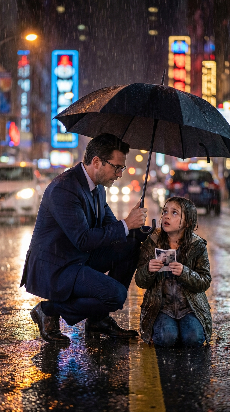 Then a man stopped. Umbrella in hand, dark suit impeccably cut, glasses reflecting the city lights—Jonathan Reeves. He knelt to her level, his voice calm yet urgent. “Are you okay?”