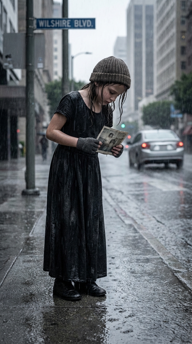 The rain began as if the sky itself mourned, drumming against Sophie Carter’s soaked black dress. Eight years old, trembling, she clutched a small photograph of her father, Thomas Carter, the man whose sudden heart attack had ripped her world apart. The funeral was over, the mourners gone, and her stepmother Vanessa had abandoned her on the slick streets of Los Angeles, stepping into her silver Mercedes with a cold “Get out.”
