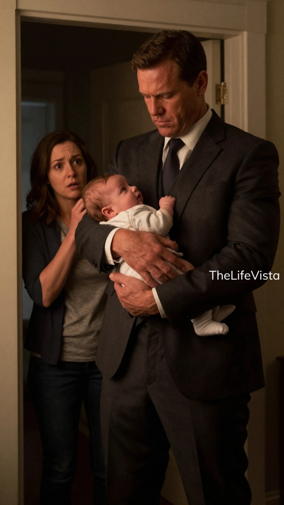 The sound of her daughter crying broke that fragile balance, pulling her back with sudden urgency. She rushed toward the room, her mind already racing through possibilities, only to stop abruptly when she reached the doorway. A man stood there, holding the child with surprising care, his presence commanding without needing to move. The room seemed smaller around him, his calm expression revealing nothing while his eyes observed everything. For a moment, fear and confusion collided, leaving her uncertain how to respond.