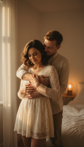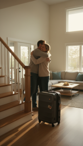 Before she could set down her bag, Ryan hurried down the stairs and wrapped her in a tight embrace. “You’re back!” he exclaimed, holding her as if they had been apart for years. “Come to the bedroom, I missed you so much.”