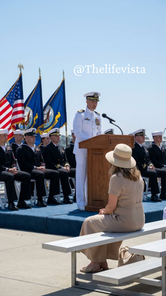 He left the sentence unfinished, stepped away from the podium, and walked down the little steps with the controlled haste of a man who doesn’t run in front of his sailors but also doesn’t dawdle. The rows parted for him without anyone needing to be told how to make space. He stood in front of Linda and—in a voice that wasn’t a voice at all so much as a memory being tested—asked, “Ma’am, would you stand?”