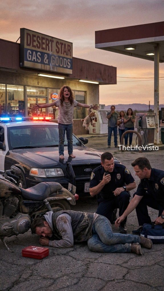 When she straightened on the hood, she threw her arms wide as though she meant to block the car with her whole body. One officer barked at her to get down, his voice cutting through the rising murmur from the people near the pumps and the storefront. She did not obey, and she did not even flinch in the way you might expect from someone so small being shouted at by a uniformed stranger. A worn stuffed dog dangled from one wrist, its fur rubbed thin and one ear hanging loose by a seam that had nearly torn through. Her bare feet shifted slightly on the curved metal, gripping for balance, but her stare never left the officers. She looked frightened, yes, but far more than that, she looked certain.