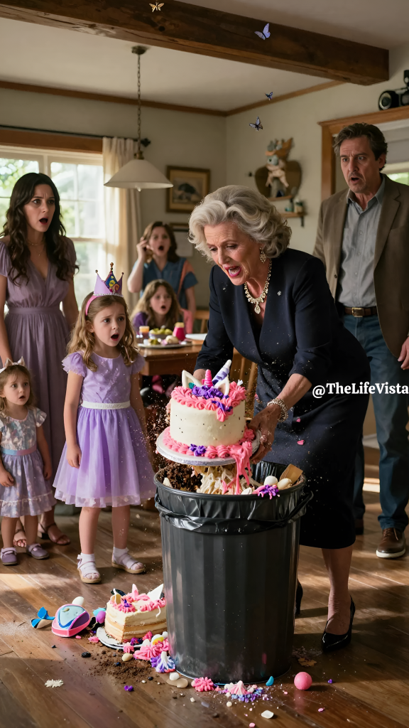 My mother-in-law, Priscilla Vaughn, stood over the kitchen trash can with my daughter’s unicorn birthday cake balanced in both hands as if she were disposing of hazardous waste instead of a dessert made for a child. The cake wobbled slightly above a black plastic liner already holding coffee grounds, orange peels, crumpled paper towels, and the stale scraps of our breakfast, and for one surreal second I could not make my brain accept what my eyes were seeing. I had baked those three layers of vanilla sponge myself, filled them with strawberry cream because it was my daughter’s favorite, and stayed awake until two in the morning shaping buttercream flowers and a fondant unicorn with a rainbow mane and a gold horn. “She has not earned a celebration,” Priscilla said in a voice so cold and final that it sliced straight through the last notes of “Happy Birthday,” which had still been echoing through our living room only a second earlier. The singing died instantly, and so did every trace of warmth in the room. My husband, Nolan, stood next to me with his palms still half-raised from clapping, motionless and useless, the picture of a man who had spent his whole life freezing whenever his mother decided to become a storm. Our daughter, Tessa, just seven years old, stared at her grandmother with a kind of stunned grief that no child should ever have to feel on her birthday. Around us, the other parents went silent. Their polite smiles vanished. Their children, who had been laughing and wiggling and shouting over one another a moment earlier, stopped moving as if someone had pressed a button and paused the entire afternoon. What happened next was something Priscilla would regret for the rest of her life, because my daughter did not shatter the way she expected. She straightened.