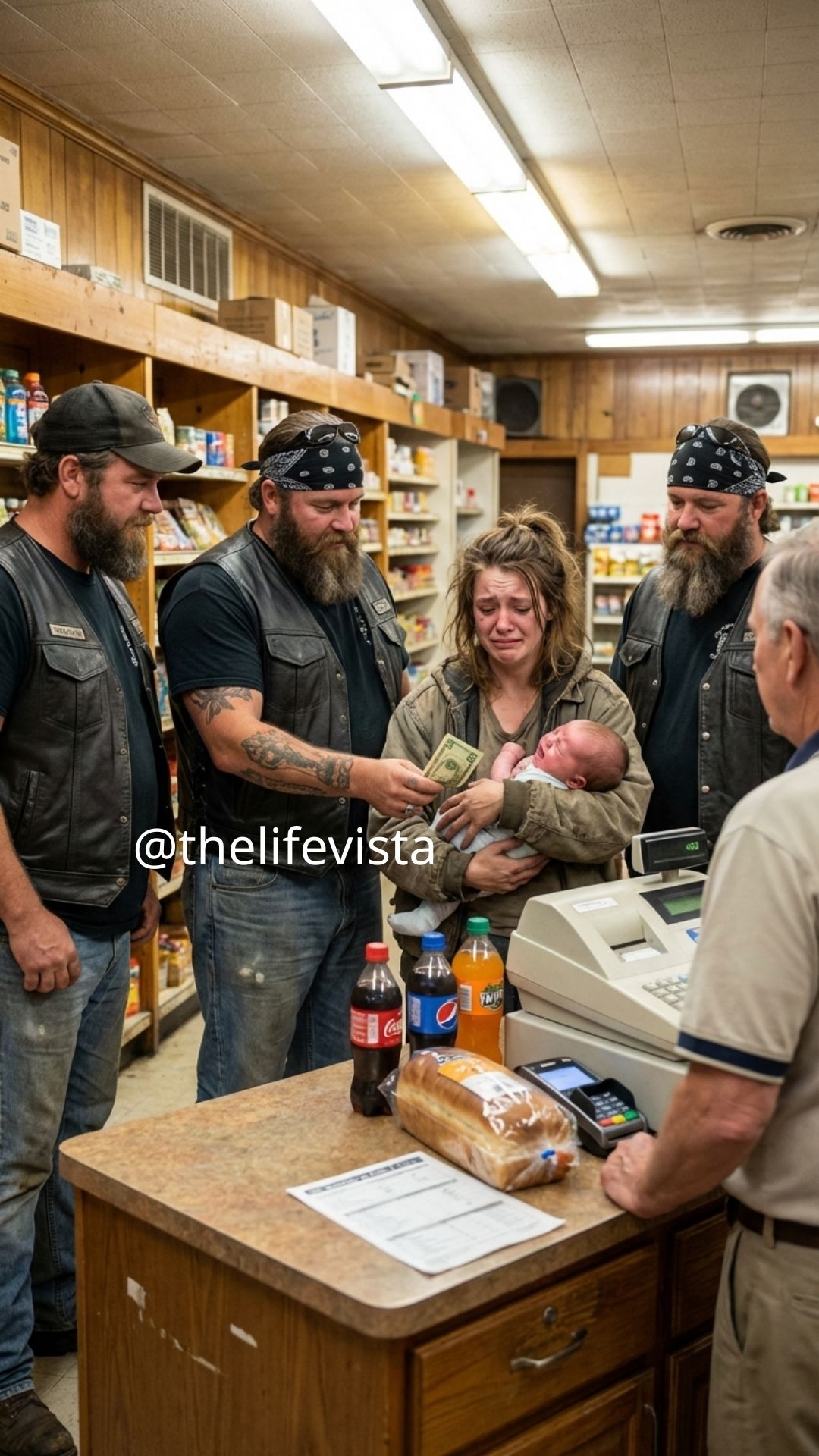She stood frozen at a gas station checkout with seven dollars in her hand, her baby screaming from hunger, her card rejected, and every stranger pretending not to see — until three men in leather vests everyone feared began walking straight toward her, and in that moment the world felt cruelly small, like the walls were leaning in to witness her humiliation. The fluorescent lights above the convenience store counter buzzed faintly, the sound sharp and unbearable in the heavy silence that followed the cashier’s flat voice, a silence that pressed down on her chest harder than the weight of the child in her arms.