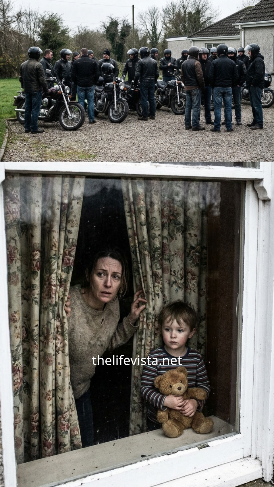 At the center of it all sat men who looked carved from stone—gray beards, tattooed arms, unmoving expressions—staring directly at her building.