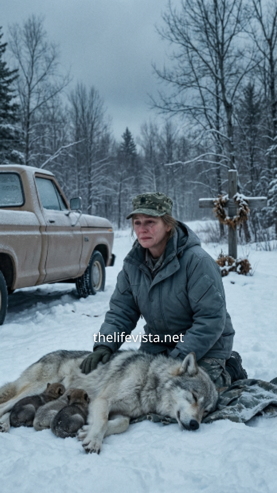 She was enormous, her fur tangled with frost and streaked in grey and silver. She lay on her side, two tiny cubs pressed desperately against her abdomen, their small bodies trembling violently. The mother’s breathing came in uneven, broken spasms.