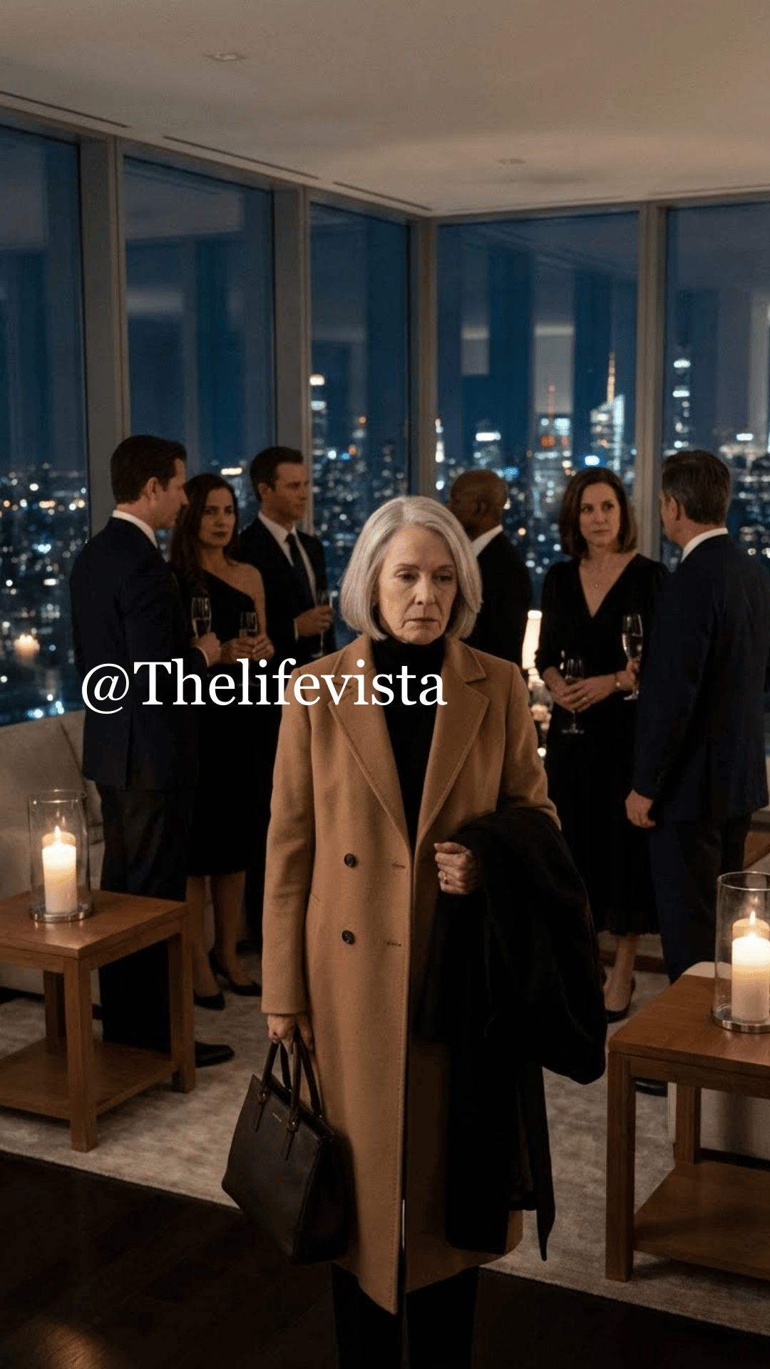 The penthouse was glowing. White orchids lined the marble counter. Guests laughed easily, dressed in designer suits and silk dresses. Lucas Collins, her son, stood at the center of it all, confident and polished, raising a glass to toast another successful year. Margaret watched from the edge of the room, her hands folded tightly, her coat still on despite the warmth.