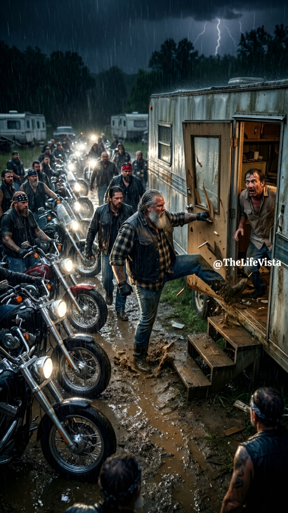 Rows of motorcycles filled the muddy road like an army. Leather jackets gleamed under the headlights while men climbed off their bikes with calm, deliberate movements. The engines kept roaring as if the machines themselves were angry.