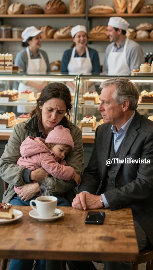 In her arms she held her daughter, a small girl named Lily, barely four years old, wrapped in a faded yellow sweater that had once been cheerful, her cheek pressed against her mother’s shoulder with the unthinking trust only children possess, tiny fingers curled tightly into the collar of Clara’s coat as if anchoring herself there. The shop was warm, almost overwhelmingly so, and the contrast struck them immediately as the scent of fresh bread mingled with sugar, butter, and vanilla, golden light spilling across glass display cases where cakes sat like museum pieces, layered in chocolate, glazed with fruit, topped with flawless spirals of cream. For a moment Clara stood motionless, not from cold but from how far removed this world felt from her own, and Lily shifted in her arms, lifting her head to stare at the display with cautious wonder. “Mom,” she whispered, voice careful as if hope itself were fragile, “is that a birthday cake?” Clara felt her throat tighten before she answered, telling her yes, they were, though she had not planned to come inside at all, having stood outside for several minutes weighing whether humiliation would hurt more than her daughter’s disappointment, fingers gripping the frayed strap of her canvas bag as she finally forced herself forward.