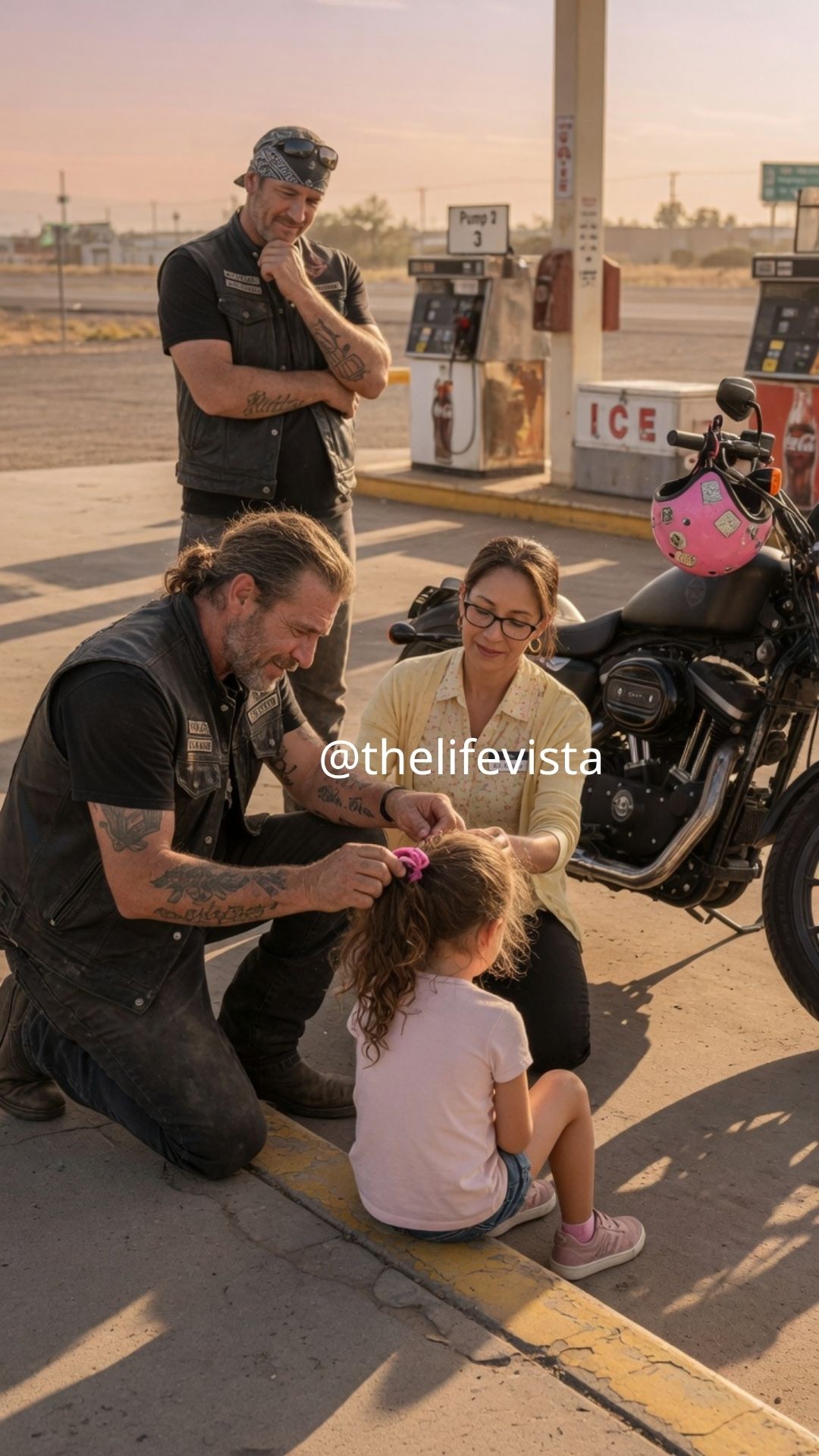 At first, it seemed unremarkable. A parent helping a child. Something easily ignored in the middle of a busy travel day. But something about him held my attention longer than it should have. He was large — solid in a way that suggested a lifetime of physical work and road miles. His tattooed arms moved carefully, almost uncertainly, as he tried to gather the girl’s hair into something neat. A worn motorcycle stood behind him, angled toward the road, a small pink helmet hanging from the handlebar.