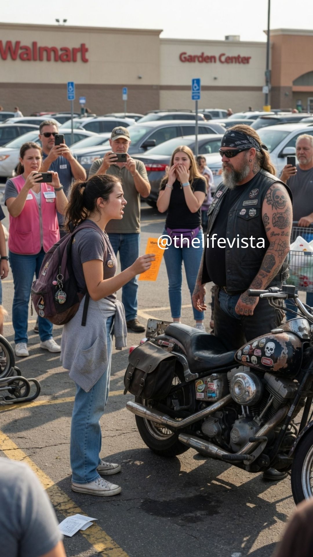 As she carefully rolled the rusty Harley through the quiet Walmart parking lot, everything changed. A tall, broad-shouldered man stepped forward. He wore a worn leather vest, his muscular arms covered in tattoos that twisted like living vines. His heavy boots were planted firmly on the asphalt, and his eyes were hidden behind dark sunglasses despite the soft morning light.