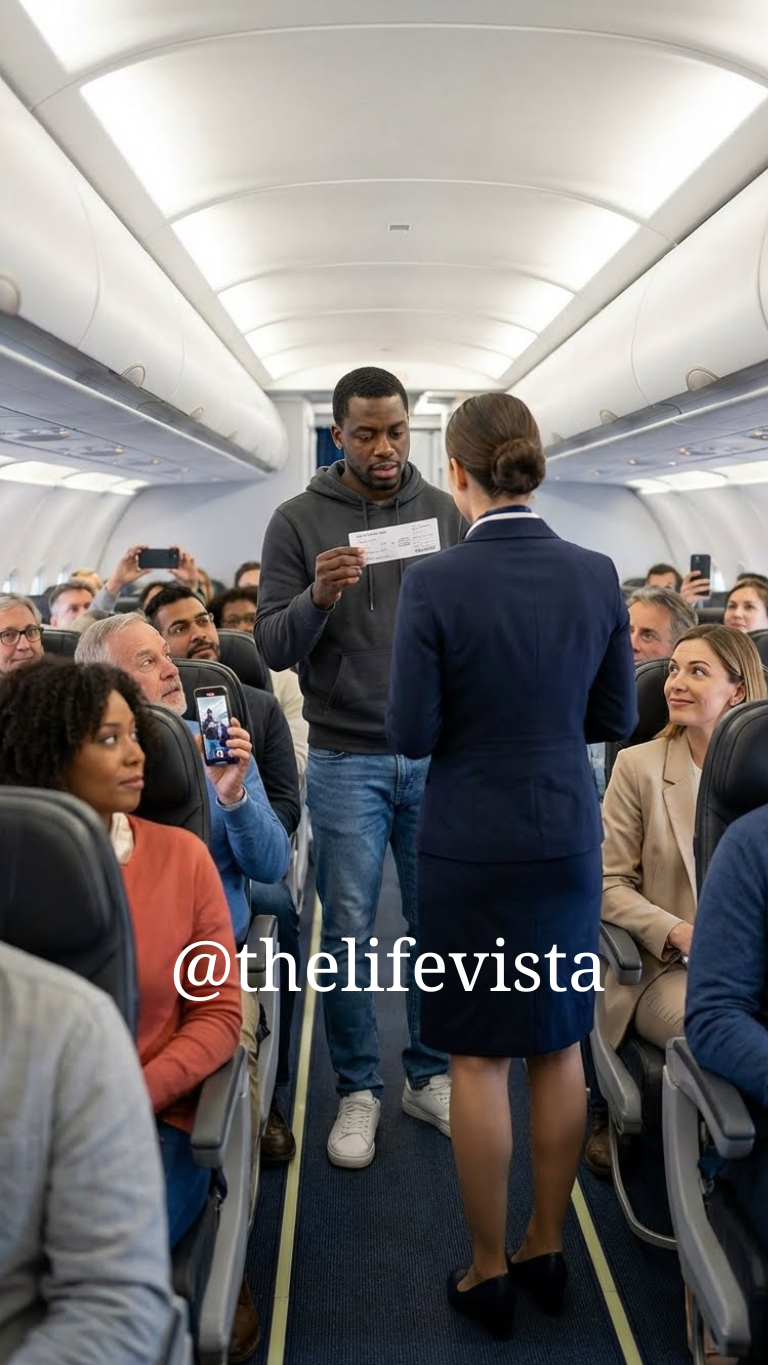 “Sir,” she replied, her smile tightening, “economy seating is toward the rear of the aircraft.”