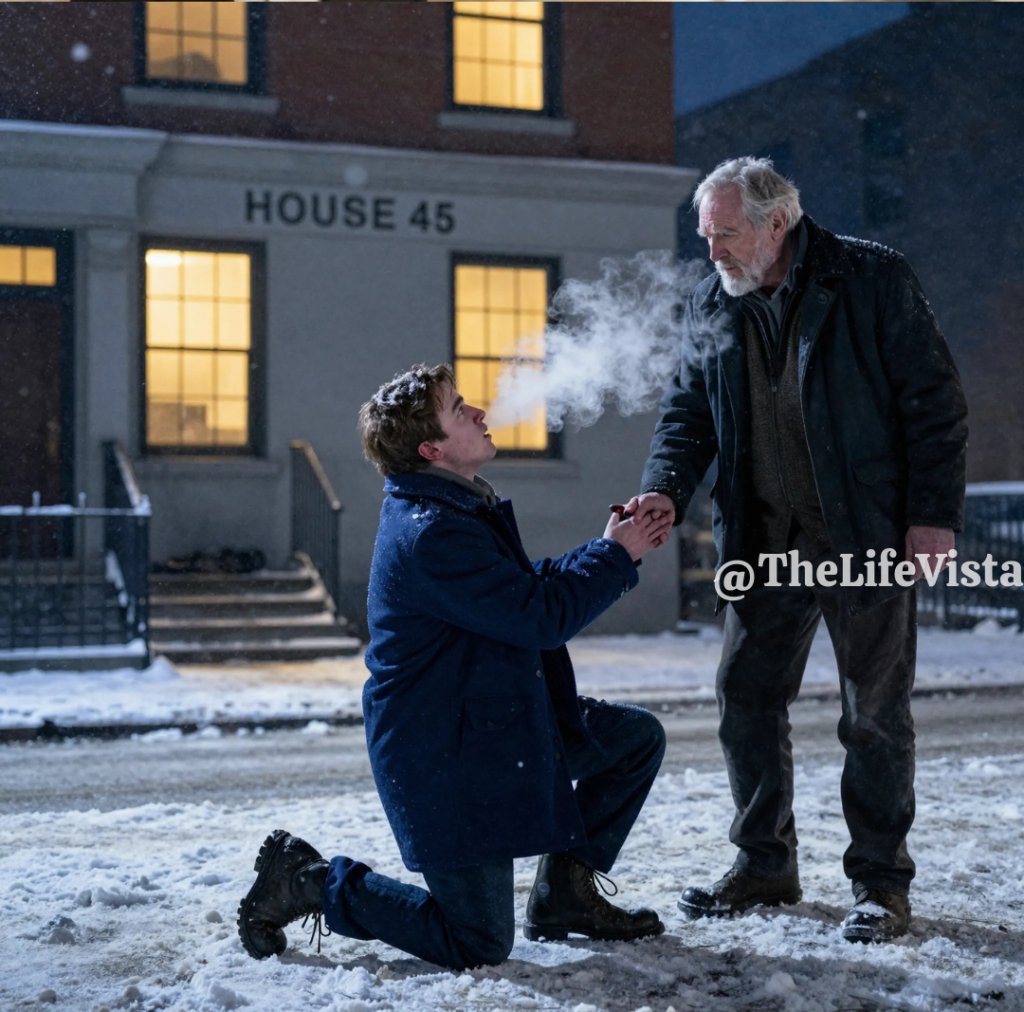 A tall, gaunt figure walked out. He moved with the unhurried authority of a man who had never been afraid of weather, of other people, or of much of anything. He pushed open the rusted gate, crossed the street, and stopped two feet from where Ethan knelt in the drift.