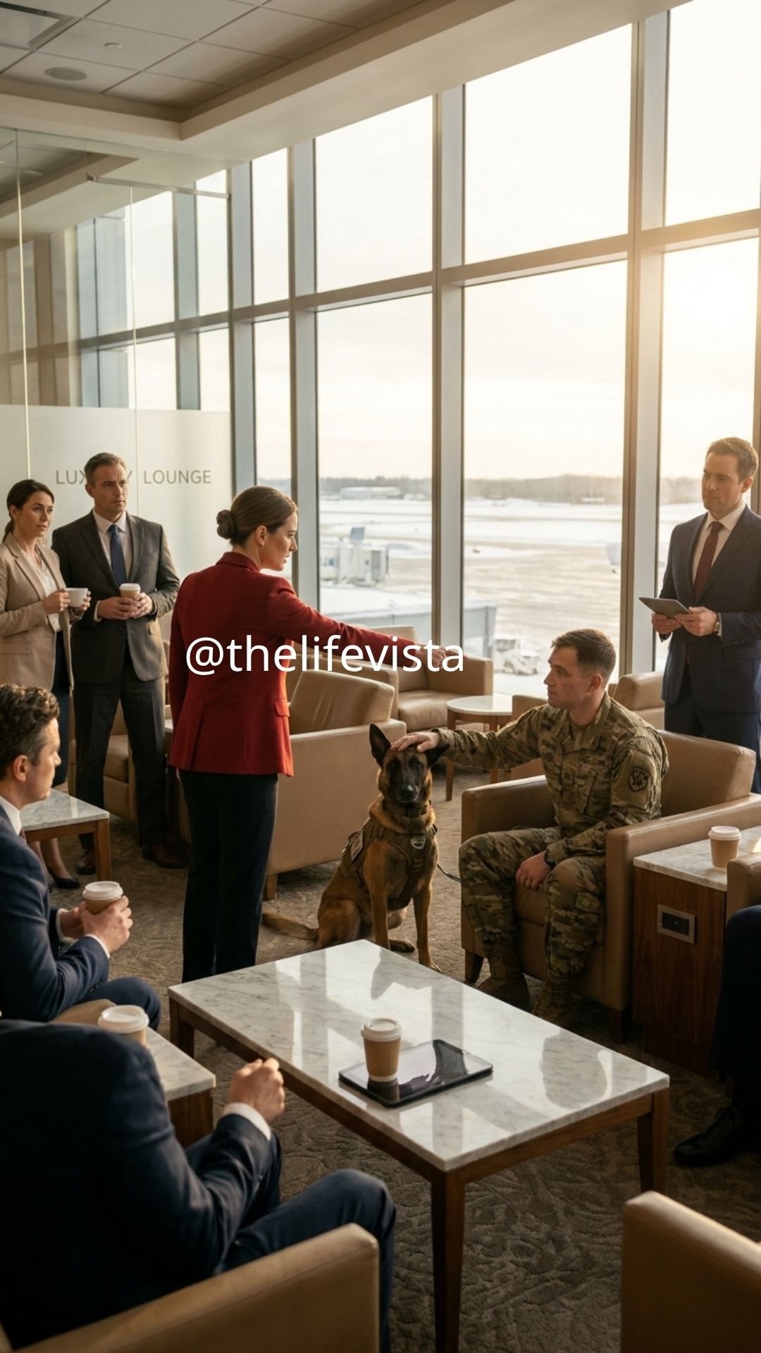 A woman near the coffee station lowered her cup very slowly. An older man in a charcoal coat frowned. One of the lounge attendants took a hesitant step forward and then stopped. It was not just the cruelty of what Ava had said — it was Titan’s impossible stillness, Liam’s restraint, the feeling that something solemn was being mishandled in public.