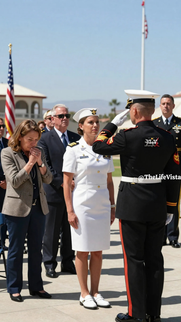 When the announcer asked the audience to rise for the arrival of the official party, the amphitheater shifted all at once. Programs rustled. Chairs scraped. The line of senior officers and enlisted leaders moved down the side aisle with ceremony polished into every step. At the front of that line walked a Marine brigadier general named Adrian Cross, a man with ribbons arranged on his chest like an immaculate block of color and a posture so exact it looked engineered. Beside him was Admiral Mercer, who moved with the kind of still authority that made it seem as if the air itself adjusted around him. They were heading toward the front row reserved for dignitaries when General Cross’s eyes shifted. They landed on me. His face did not break discipline, but his gaze sharpened in immediate recognition. He altered course without hesitation, stepping out of the line and coming directly toward me. My father’s story died in his mouth mid-sentence. The little ring of parents turned with him, curiosity blooming into full attention. General Cross stopped in front of me, came to attention with the instinctive precision of a man who had saluted in deserts, jungles, and too many formal ceremonies to count, and then he raised his hand. I returned the salute automatically, muscle memory older than resentment. When he dropped his hand, he spoke clearly enough for every person around my father to hear. Rear Admiral Whitmore, he said. The title cracked through the heat like a sheet snapping in wind. I watched my father’s face empty itself. The smugness disappeared so completely it looked physically drained away, leaving bare disbelief underneath. His mouth opened, but there was nothing ready inside it. The little cluster of strangers around him stared at me with entirely different eyes now, their earlier amusement curdling into embarrassment and astonishment. General Cross’s expression softened by one degree and he added that it was an honor, ma’am. I thanked him. Behind him, Admiral Mercer paused and took in the entire tableau with one sweep of his gaze. His eyes flicked from me to my father and back again, and there was a glint there that might have been amusement if Admiral Mercer had been the kind of man who admitted to amusement in uniform. What I felt in that moment was not victory. It was relief. Something old and heavy gave way in me, not because my father had finally been embarrassed, but because reality had arrived in public with enough force that no amount of storytelling could push it back down. My father managed a strangled sound that might once have intended to become a question, but the general had already rejoined the official party and the ceremony was moving onward with the unstoppable momentum of military ritual. The crowd sat. My father remained standing one beat too long, then lowered himself carefully onto the bench as if his own knees had become unreliable.