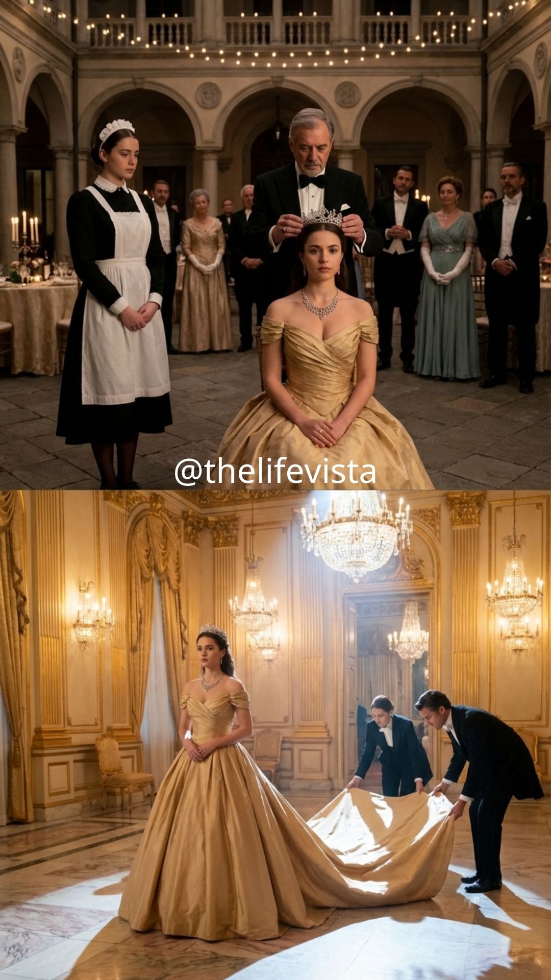 She removed the white blouse and black skirt, revealing a gold silk gown designed by a legendary Parisian designer, shimmering under the shattered lights like truth finally exposed.