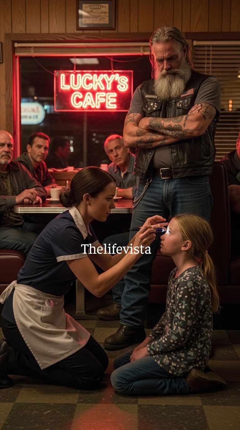 Across the diner, behind the counter where coffee cups were stacked and napkins folded, Elara Sterling, a twenty-four-year-old waitress who had worked at Rosita’s for nearly four years, froze mid-motion, her hands still wrapped around a damp cloth as she watched the scene unfold with a tightening in her stomach that had nothing to do with fear and everything to do with recognition.