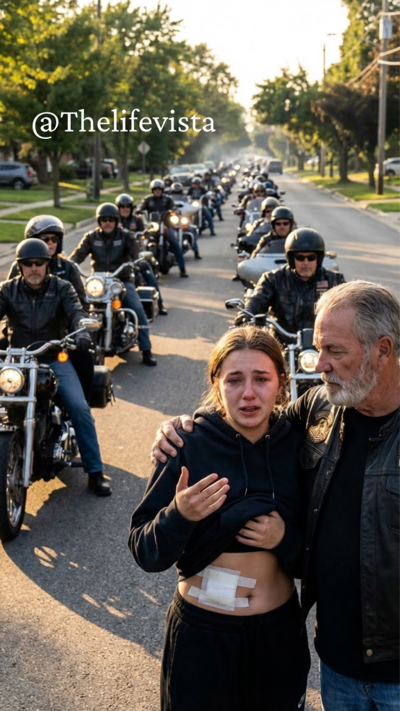 Across the street, Mrs. Alvarez came out onto her porch, then quickly went back inside, pulling her young son with her. Other neighbors appeared in windows or doorways, some holding up phones to record what was happening. A few shouted to each other over the noise. “Call the police,” someone yelled. But no one moved to help as the motorcycles formed a tight ring around Emily’s house, three deep in some places.