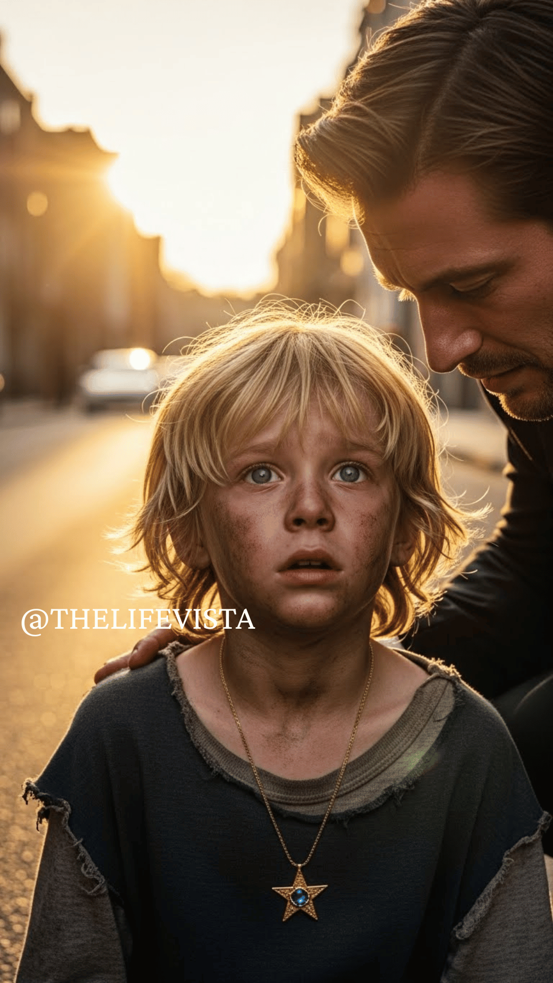 Andrew Walker’s world shattered the moment he saw the street boy sitting on the sidewalk, barefoot and filthy, a plastic bag clutched to his chest—and around his neck, a necklace that stopped Andrew cold. It was a gold star-shaped pendant with a small emerald in the center. He knew it intimately. Only three existed in the world. One had belonged to his daughter Madeline, who vanished five years ago without a trace.