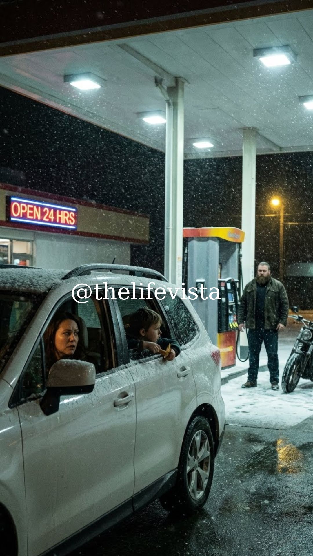 Outside, the cold cut straight through her thin jacket. She scanned the parking lot desperately—families too busy, truckers turned away, strangers moving fast to escape the storm.