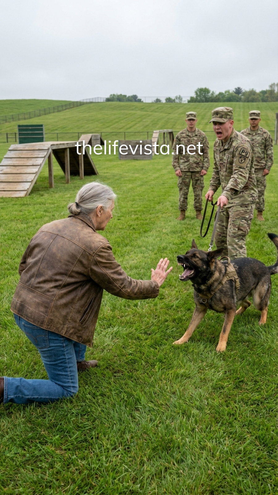 The first person through the corridor door wasn’t a colonel. It was Captain Olivia Hart, the base veterinarian, eyes wide with professional urgency. Behind her came a major from operations and two MPs who looked braced for worst-case. They stopped when they saw the reality: Rook lying quiet, muzzle relaxed, no lunging, no spiral. Reese kneeling at a safe angle. And an older woman in a cardigan resting two fingers against the fence like she belonged there.