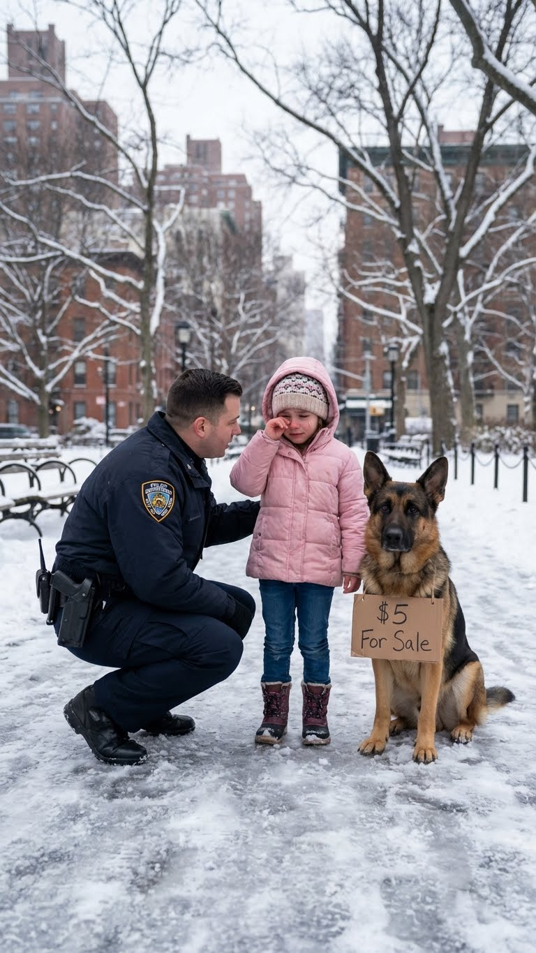 Snow came down hard that morning when Officer Daniel noticed a small girl sitting alone on an icy sidewalk, clutching a German Shepherd wrapped in a worn blanket. A piece of cardboard hung from the dog’s neck with shaky lettering: $5 For Sale. But it wasn’t the sign that made the officer stop mid-step.