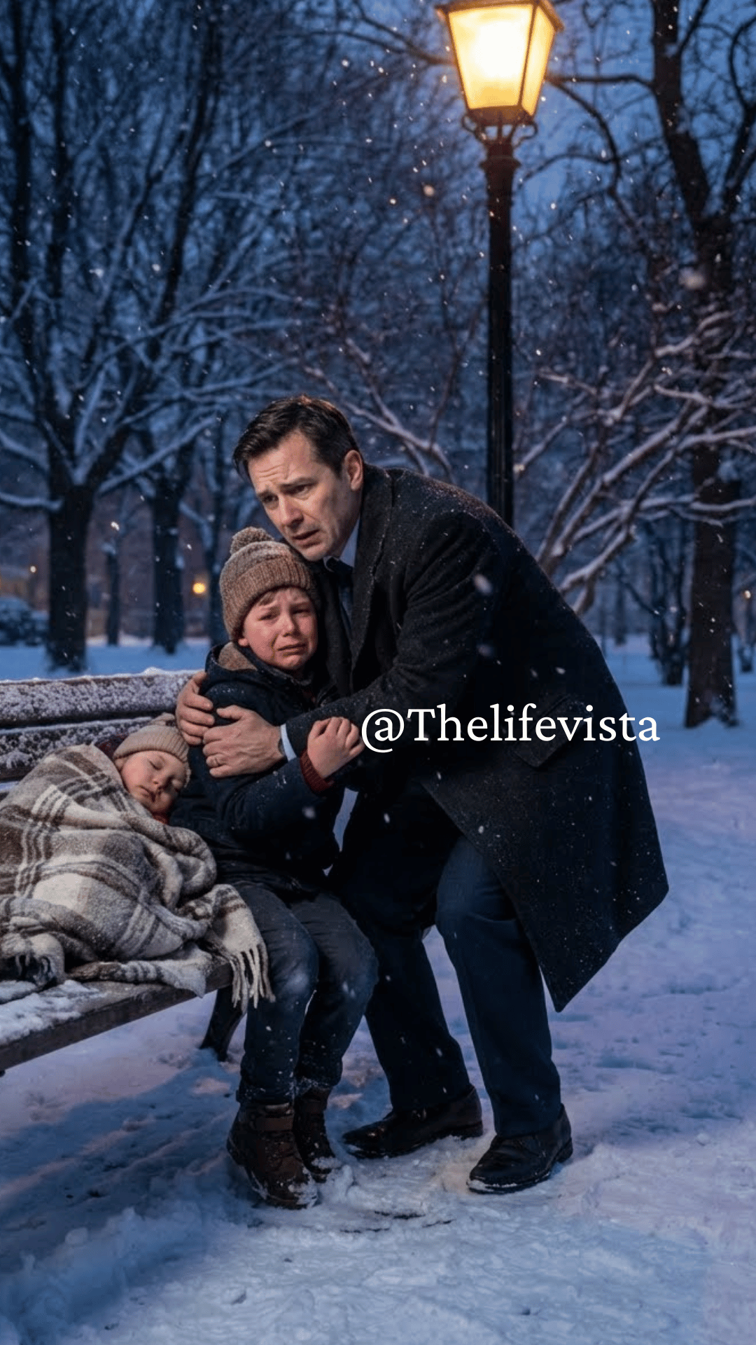 On a bench near the frozen playground sat a boy, no older than nine, his arms wrapped tightly around a toddler bundled in a thin hoodie. The little girl’s cheeks were red, her lips slightly blue. She wasn’t crying—just staring blankly, exhausted.