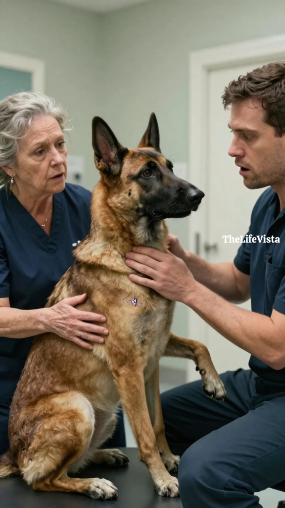 The woman nodded gently and crouched beside the dog, her movements slow but purposeful. She lifted the dog’s foreleg carefully, revealing a small mark etched into the skin. Adrian leaned closer, his breath catching as recognition struck him with sudden clarity. The symbol was faint but unmistakable, a curved line intersected by a single horizontal slash, one that most people would overlook without a second thought. To him, it was something else entirely, a fragment of a past that had never been spoken aloud.