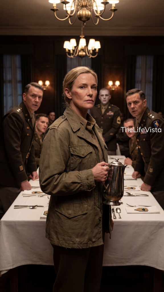 He called to her loudly enough that the surrounding group could hear. When she turned, he gestured toward the polished silver coffee pot resting near the service station and told her to make herself useful. Then, with the casual authority of someone certain the room supported him, he ordered her to carry the coffee to the VIP table and serve the general and the colonel. The laughter that followed was low and quick, not openly vicious, just enough to show that several people understood the command as a small public placing of someone beneath them. Dana met his gaze for one extra beat, not challenging, not deferential, simply looking at him long enough that he should have felt something warning him to stop. Then she picked up the coffee pot and began walking.