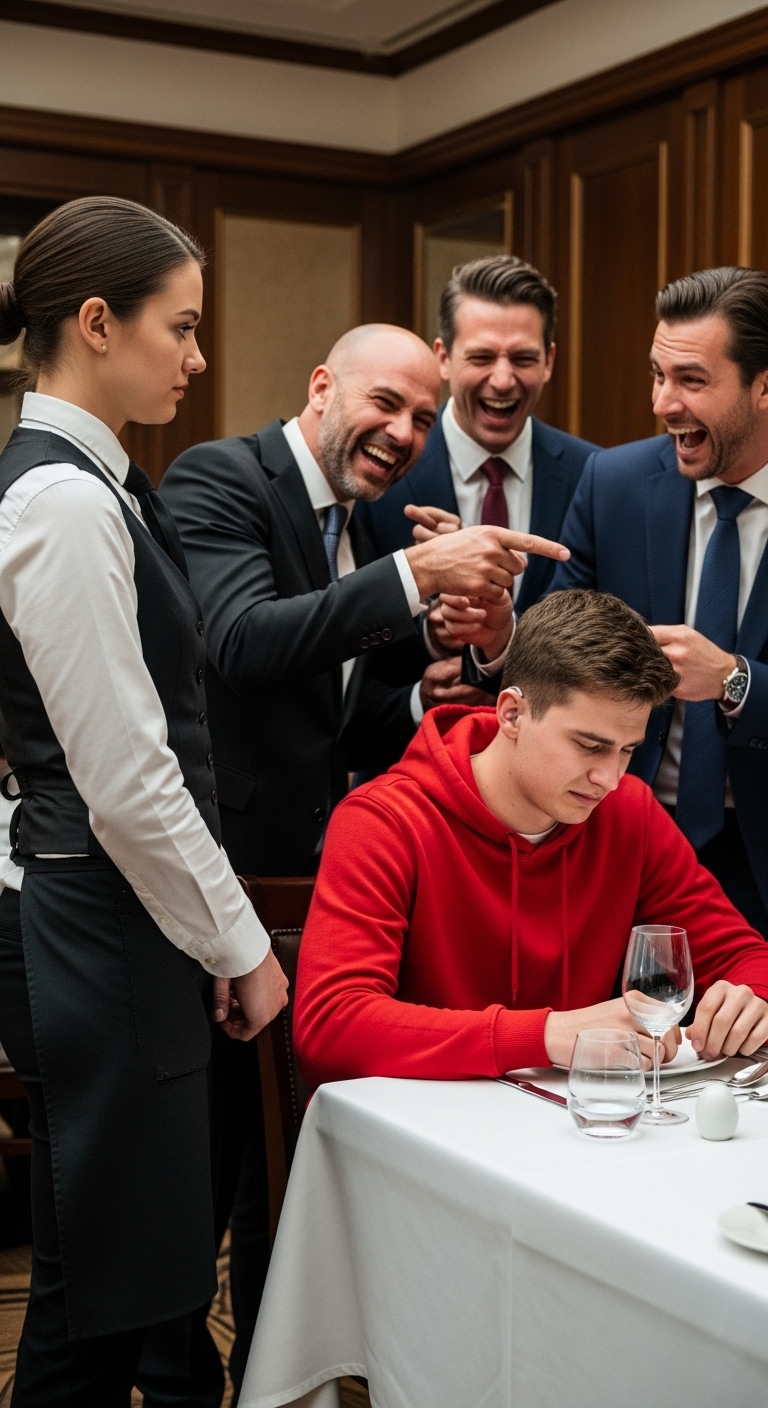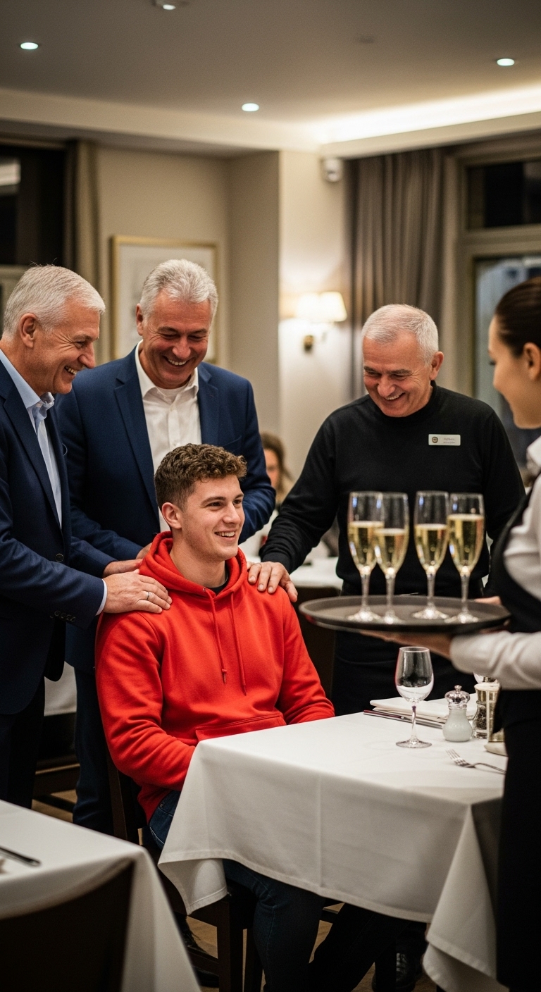 Ten minutes later, a young man slipped into the doorway alone. He wore jeans, a red hoodie, and hair that fell in front of his face like a shield. He hesitated, then crossed the room and stood at the end of Price’s table.