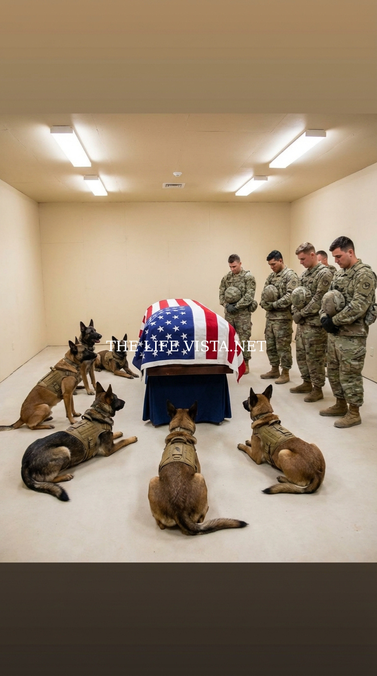 Twelve military working dogs—Belgian Malinois and German Shepherds—sat in a tight formation around the casket. Their posture was rigid. Their ears were forward. Their bodies formed a living perimeter, noses low, eyes alert. They did not whine. They did not bark. They did not move.