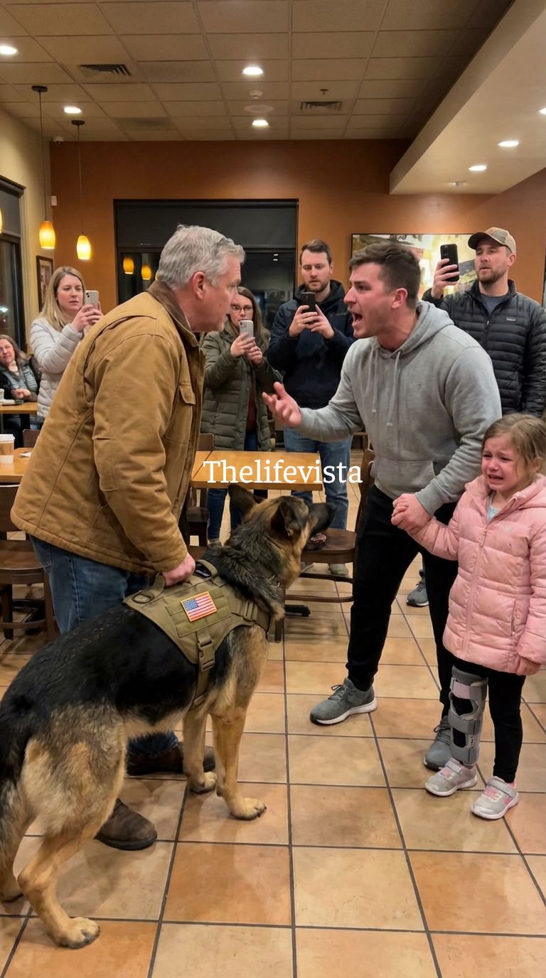 Ledger’s gaze wasn’t fixed on the girl; it was aimed past her, toward the café entrance, where nothing obviously threatening stood, and yet everything about the dog’s body language suggested anticipation rather than surprise, as if he had already identified a problem and was waiting for it to reveal itself.