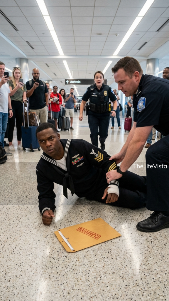 Inside the busy arrivals concourse of a major U.S. airport, Chief Petty Officer Malik Jordan moved with the controlled precision of someone trained to carry pain without showing it. Sixteen years in the Navy had shaped that posture—years spent in high-tempo, high-risk assignments that never made headlines and were never meant to. He had just returned from an overseas operation that couldn’t be discussed, still wearing his pressed service uniform because protocol wasn’t optional—it was everything, especially when you were carrying something that was never meant to be exposed in public.