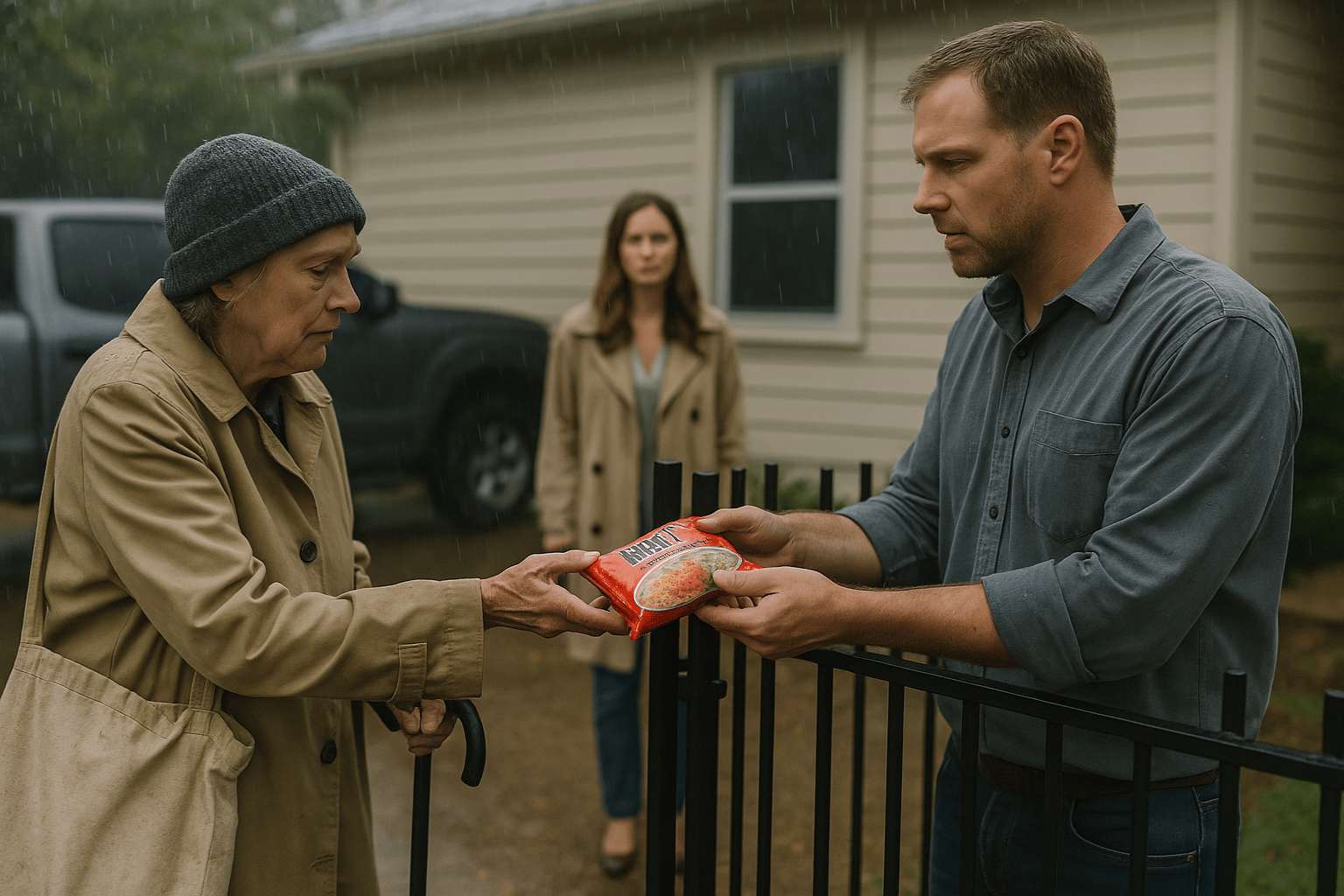 Evelyn stood there for a moment, clutching the noodles to her chest as the drizzle turned to steady rain. Her old coat grew damp, but she said nothing.