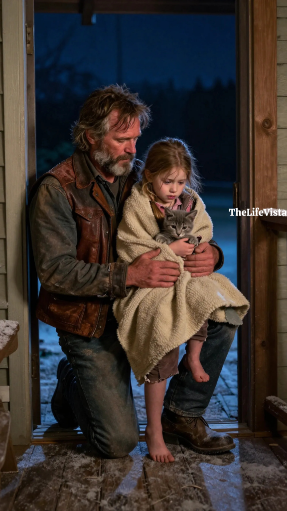 I kicked the door shut behind us and grabbed the wool moving blanket I kept folded in the hallway. I wrapped it around her small body first, then folded part of it over the kitten too. Lucy’s fingers were stiff with cold, but she did not loosen her hold on that animal even for a second. Her eyes tracked every movement I made, alert in a way no child that age should have been.