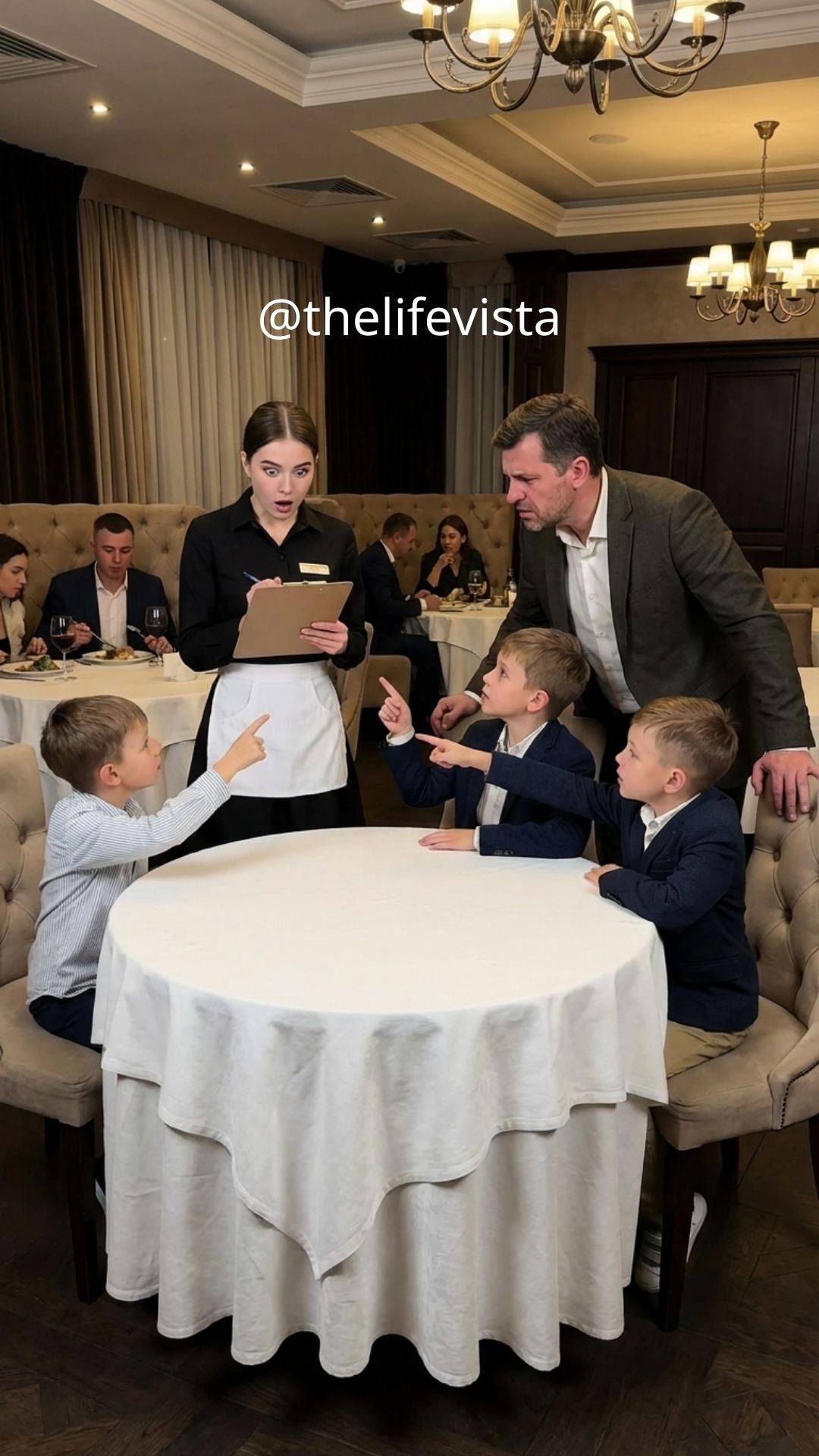 All three of them were pointing their chubby fingers at the trembling waitress on her knees, cleaning up broken glass with shaking hands. Their voices were crystal clear, and the unison made it feel like a verdict.