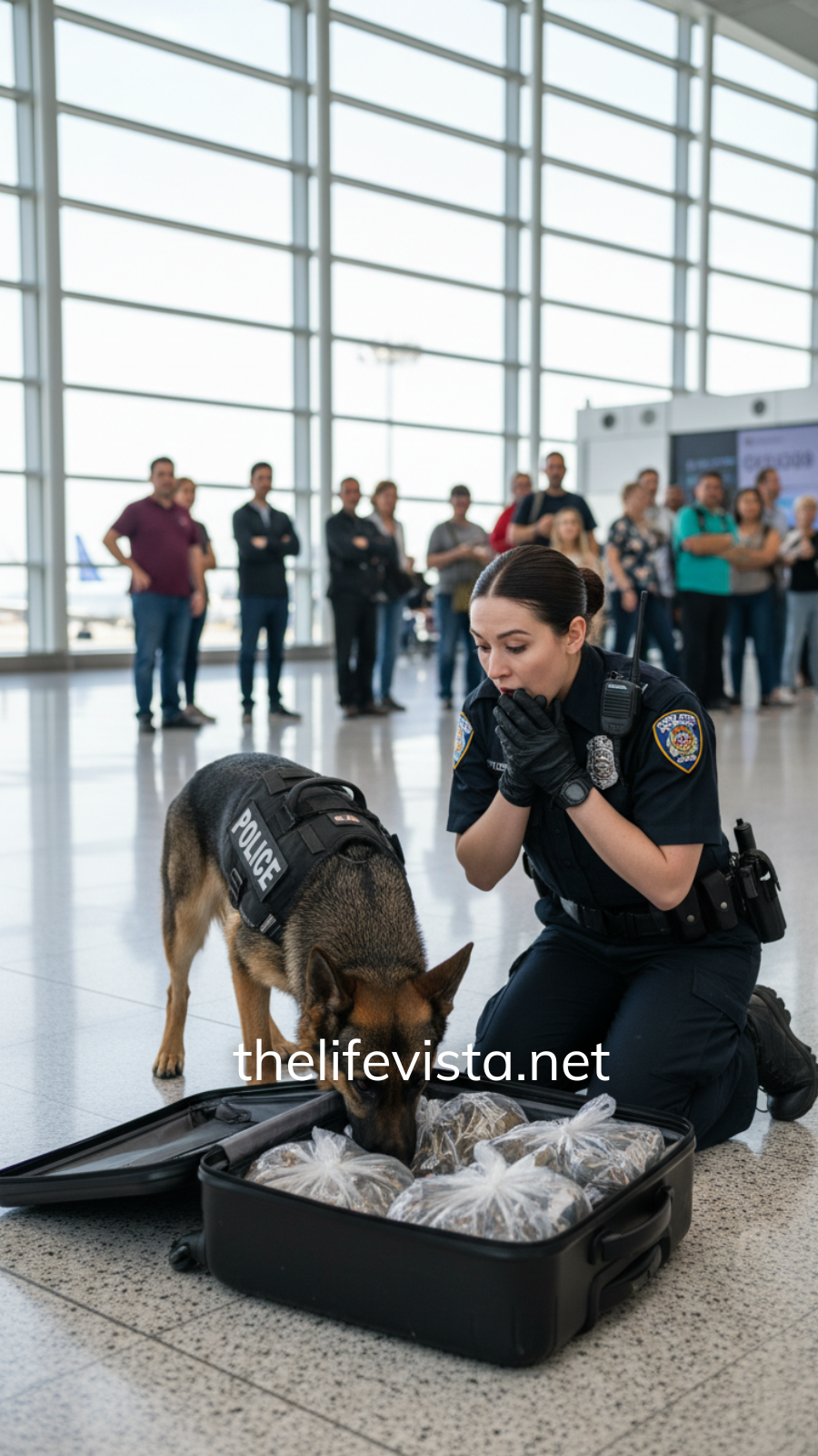 Her K9 partner, Rex, a five-year-old German Shepherd with a flawless sit-alert and nerves like steel cable, usually matched the routine with calm discipline. He moved through the terminal the way a metronome keeps time—nose working, eyes scanning, posture steady. Bags, bodies, benches, trash cans. A thousand variables, solved like math.