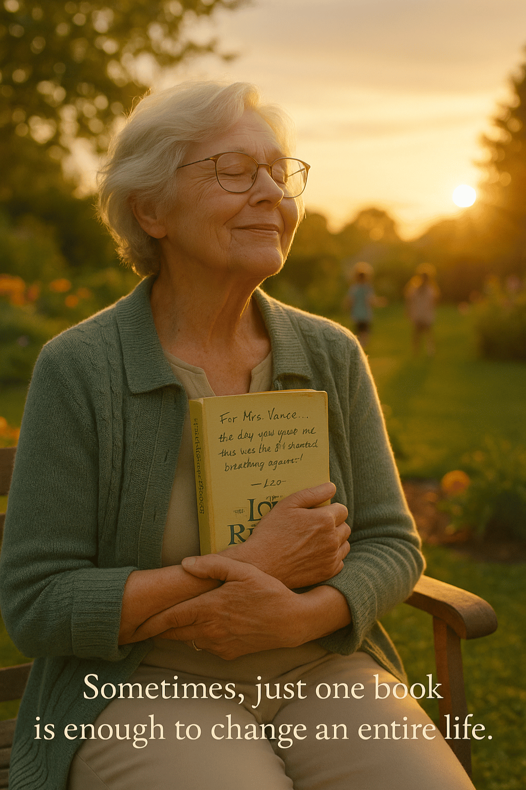Late afternoon. Eleanor sits alone in her backyard garden, the last light of day spilling gold across the flowerbeds. On her lap rests a copy of The Lord of the Rings, its cover worn, its spine patched with tape. She opens it, and inside, in neat handwriting, appear the words: “For Mrs. Vance… the day you gave me this was the day I started breathing again. – Leo.”