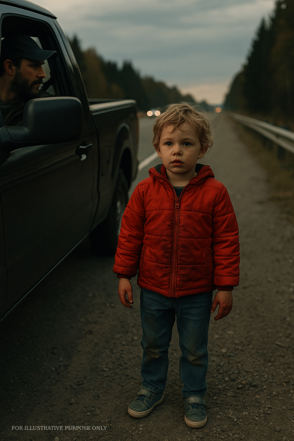 At first, it didn’t register — just a flash of color on the shoulder ahead, something red against the gray. Then, as I got closer, the shape resolved into something small. Human. A boy, no more than three, standing at the edge of the highway where the gravel meets the asphalt, the hem of his red jacket snapping in the wind.