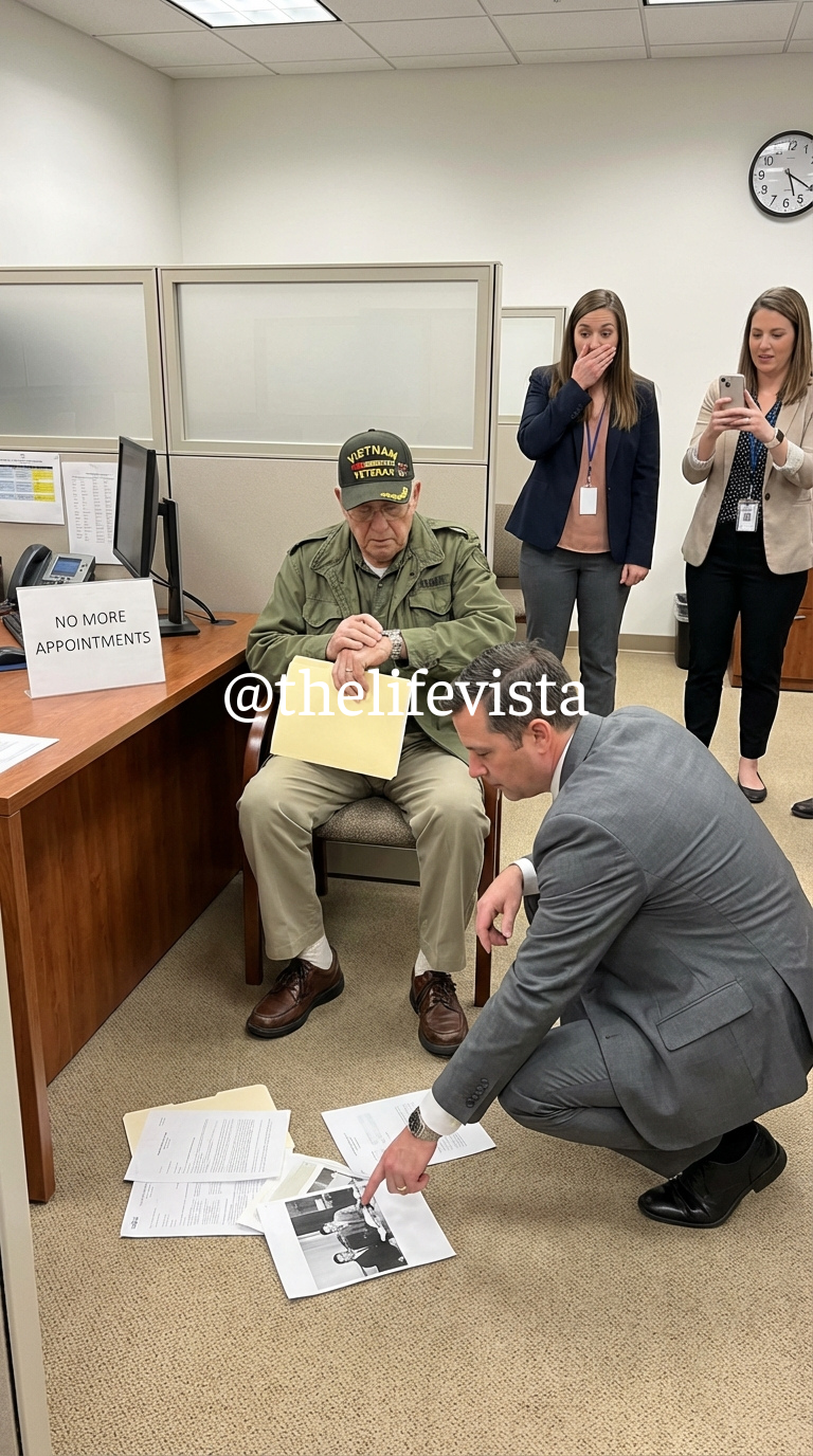 A veteran named Ethan Ramsey stood quietly in line, clutching a worn file folder that had clearly been opened, shuffled, and resealed countless times. He had been waiting for over an hour, his patience unwavering, his face calm but tired.