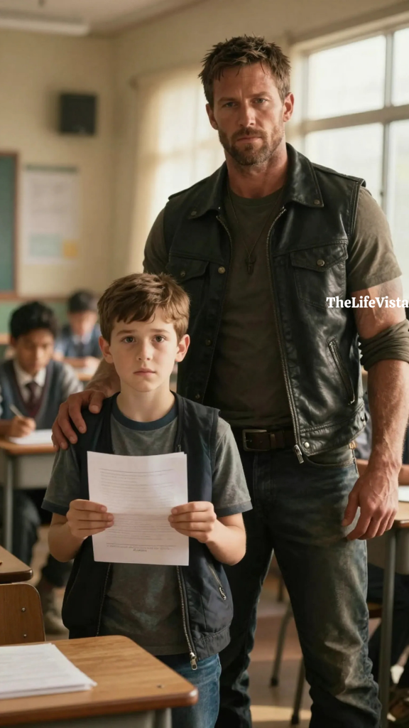The boy’s name was Daniel, and he was nine years old, a fourth grader who still believed that heroes were defined by kindness and courage. The assignment had been simple enough: write about someone you admire and present it to the class. Daniel chose his father without hesitation, filling three uneven paragraphs with stories written in careful, imperfect handwriting. He described the rumble of a Harley, the long roads his father traveled, and the quiet strength he carried with him everywhere. At the bottom of the page, he had drawn a picture of them together, holding hands beside the bike, every small detail lovingly sketched.
